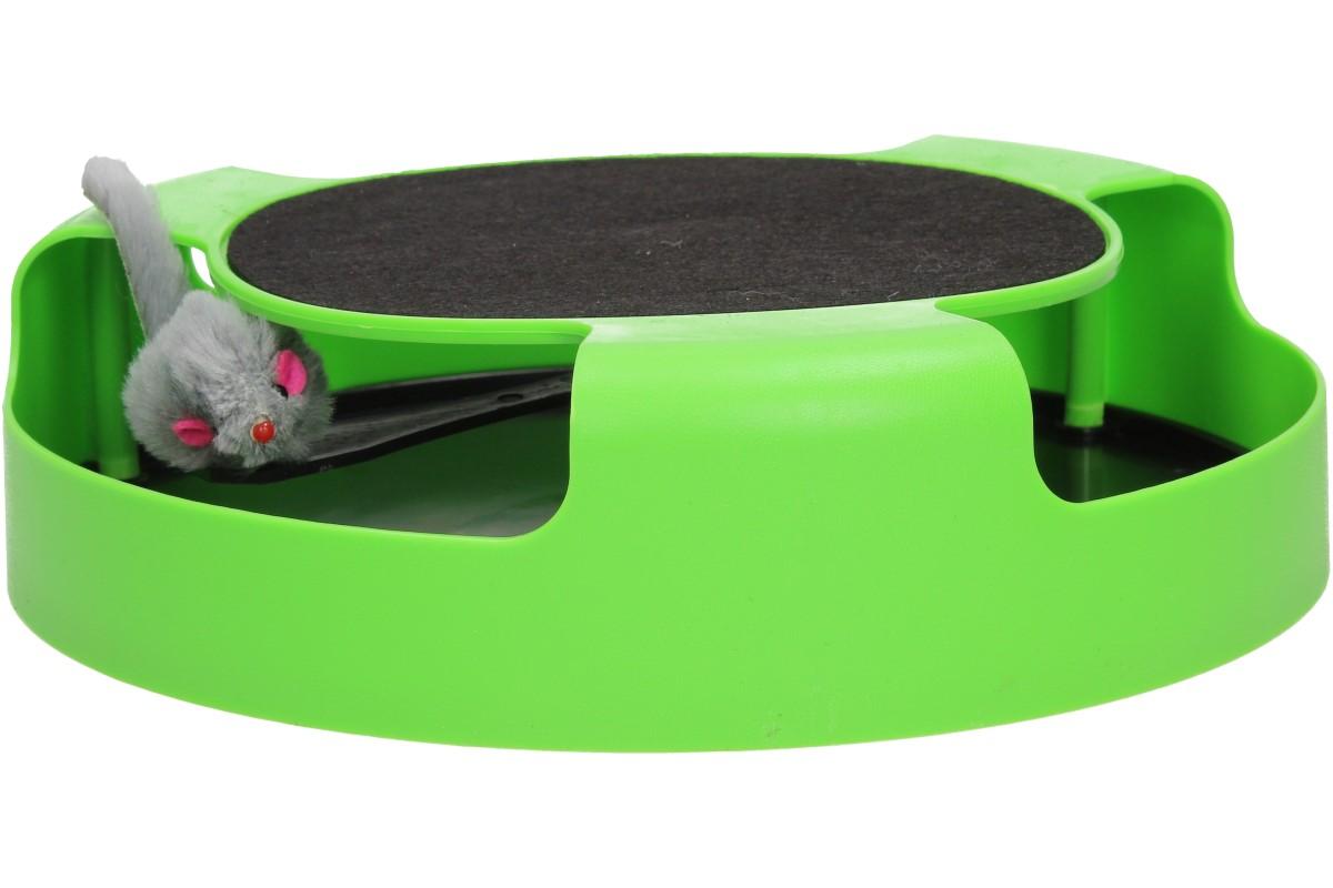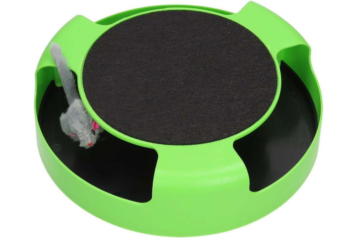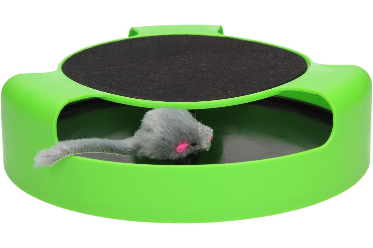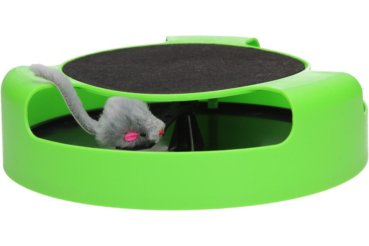 Hra na honěnou může začít! Plastová haračka je ve tvaru kruhu, má tři otvory a uprostřed se točí malá myška, která vypadá jako živá. Kočička se ji bude snažit chytit a tím uvede myšku do pohybu. Myška rotuje po obvodu kruhu, znovu se objevuje a znovu mizí z dohledu. Na horní straně je navíc škrabcí podložka, která pomáhá zachovávat drápky čisté, zdravé a silné.