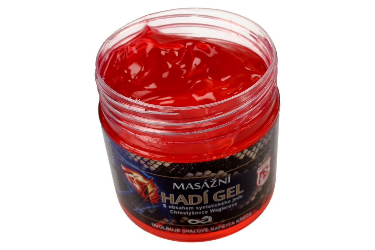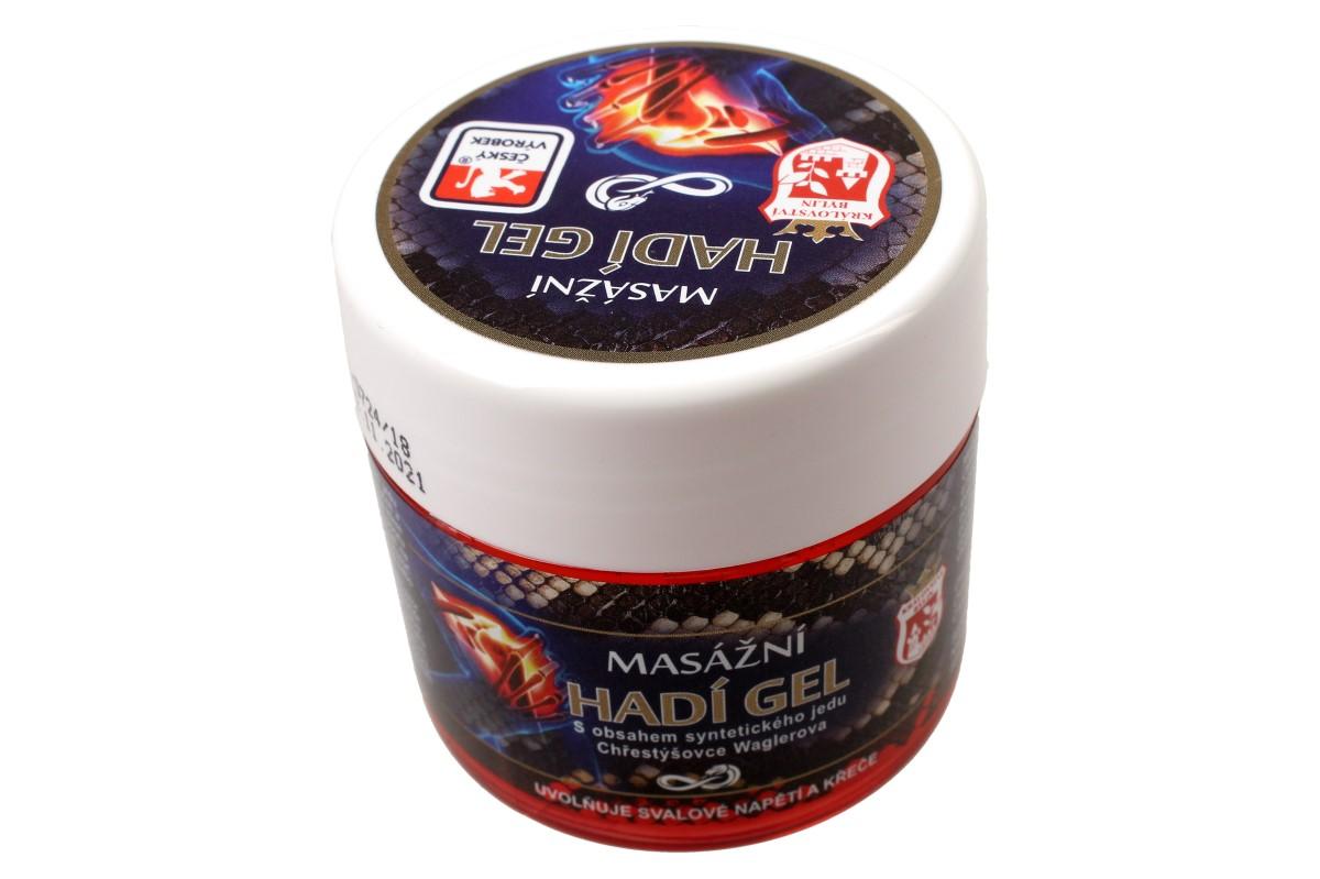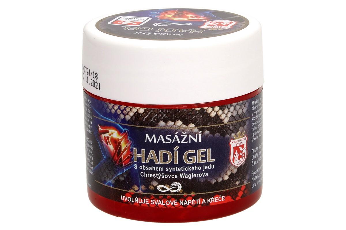 Masážní hadí gel bylinná mast 150 ml s obsahem účinné látky syn-ake založené na syntéze hadího jedu. Masáž pomáhá uvolňovat svalové napětí, působí relaxačně a regeneračně. Přípravek je doplněn mimo jiné o kostival lékařský a kaštan koňský. Gel je vhodný při pocitu těžkých nohou po celodenní námaze.