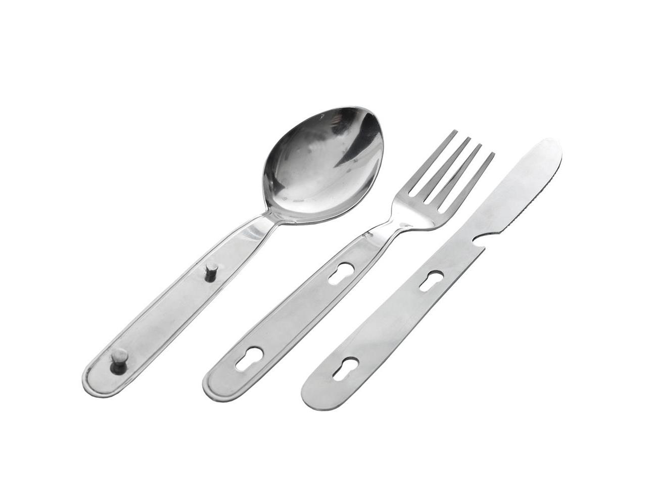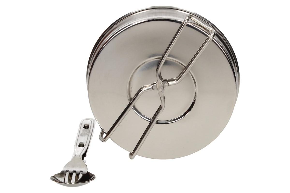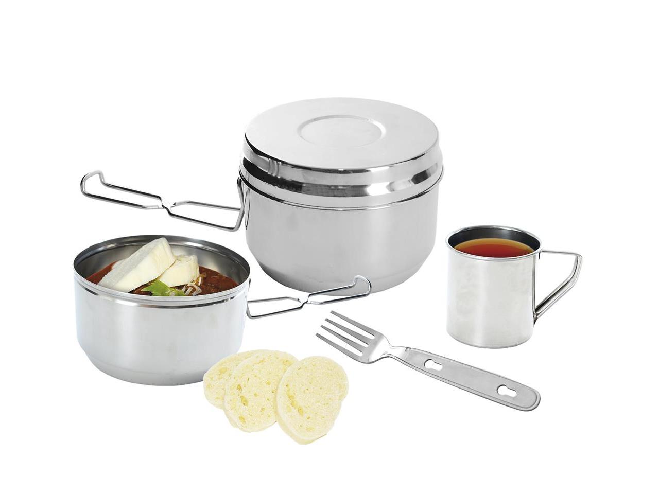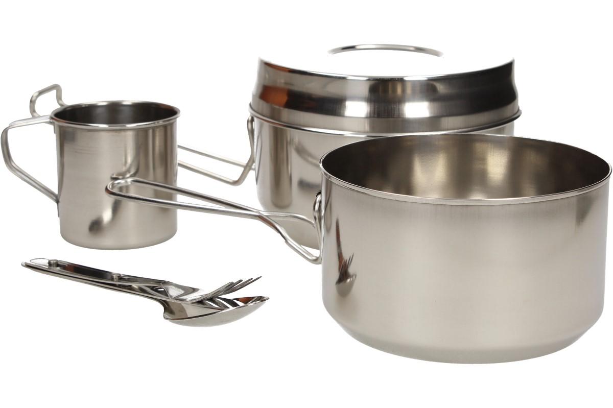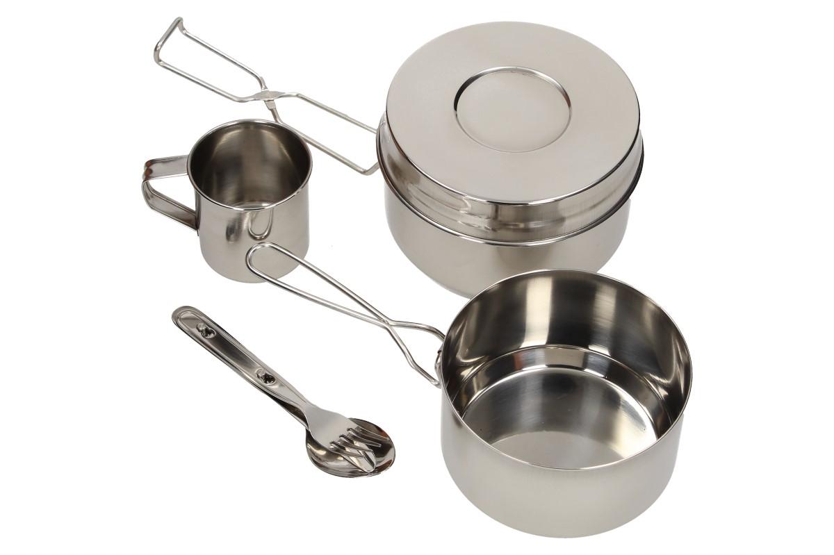 Sada se skládá z velkého a malého ešusu s uchem a pokličky velkého ešusu, kterou využijete také jako misku, dále hrníčku a příboru - na noži otvírák korunkových uzávěrů.