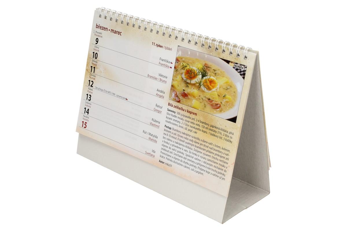 - Kalendář obsahuje: seznam jmen, obrázky a recepty polévek, seznam svátků a významných dnů, místo na poznámky, seznam pracovních hodin za celý rok.