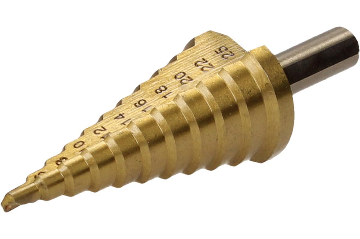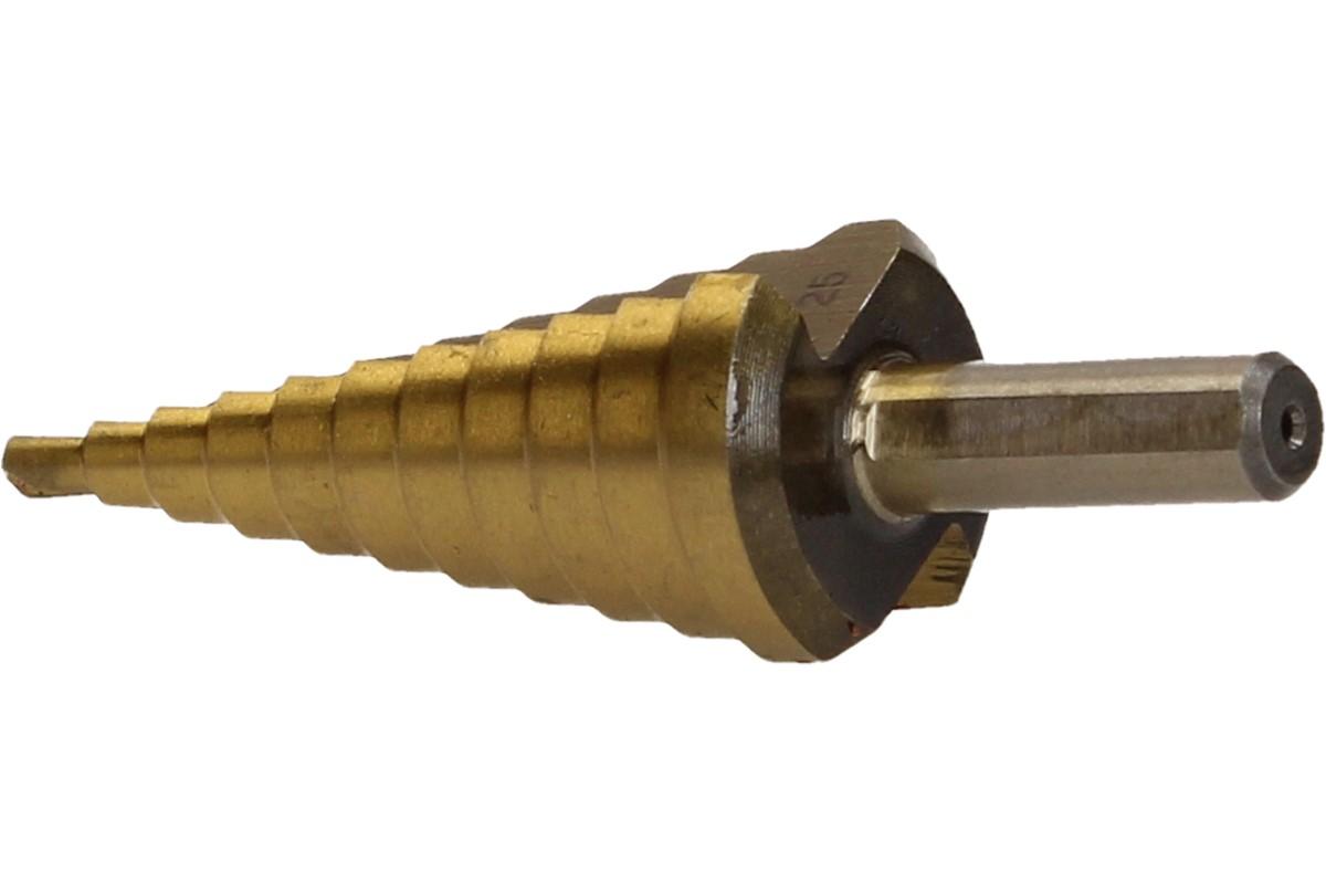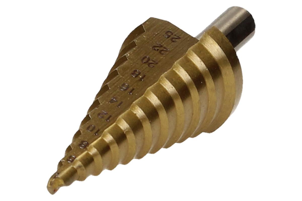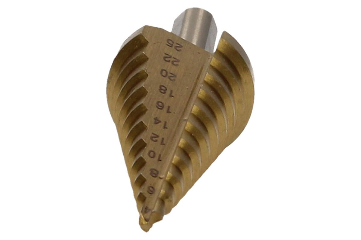 Kvalitní stupňovitý vrták zhotovený z kvalitního kovu je odstupňovaný po 2 mm v rozsahu 4–25 mm. Disponuje celkem 11 otvory a 25mm stopkou. Celková délka vrtáku činí 60 mm.