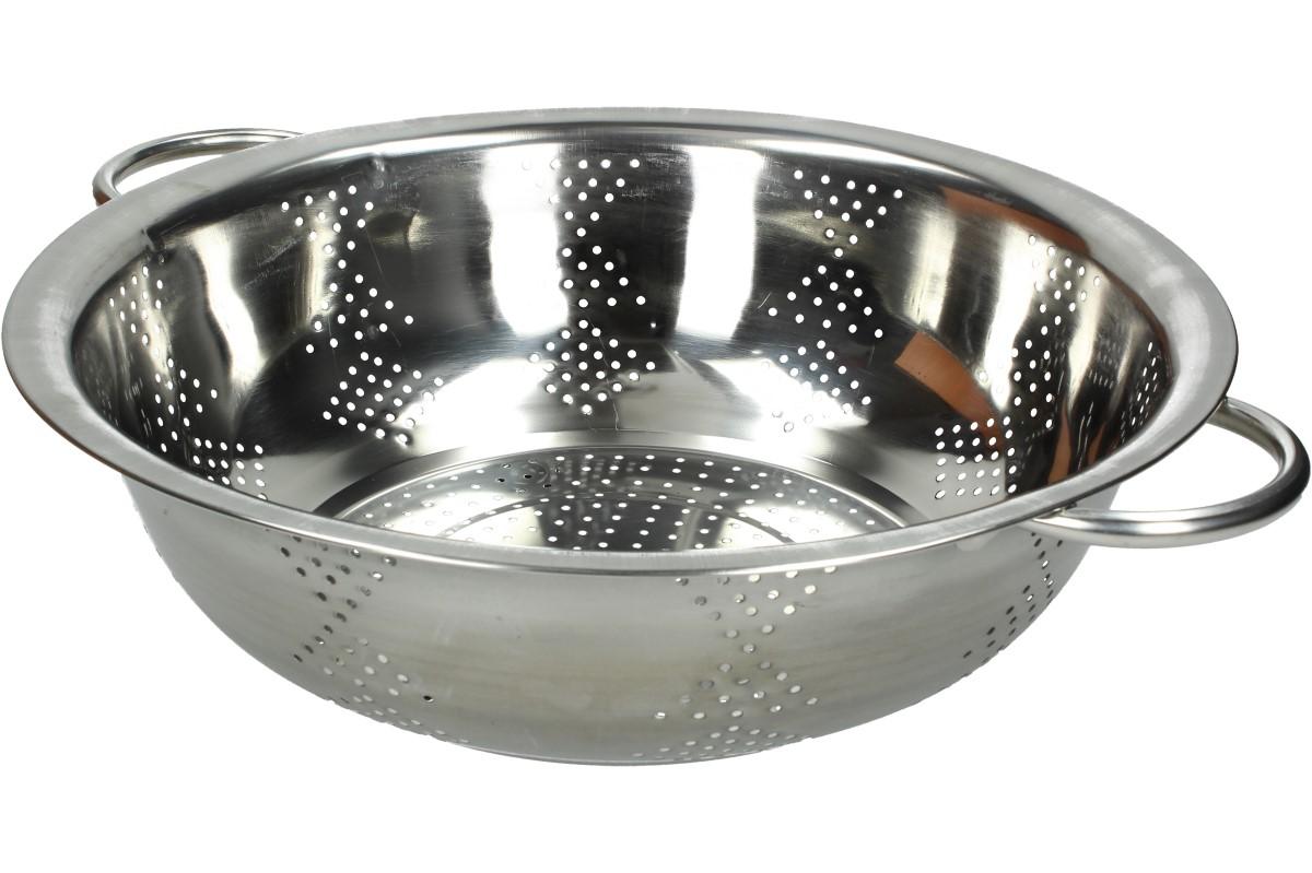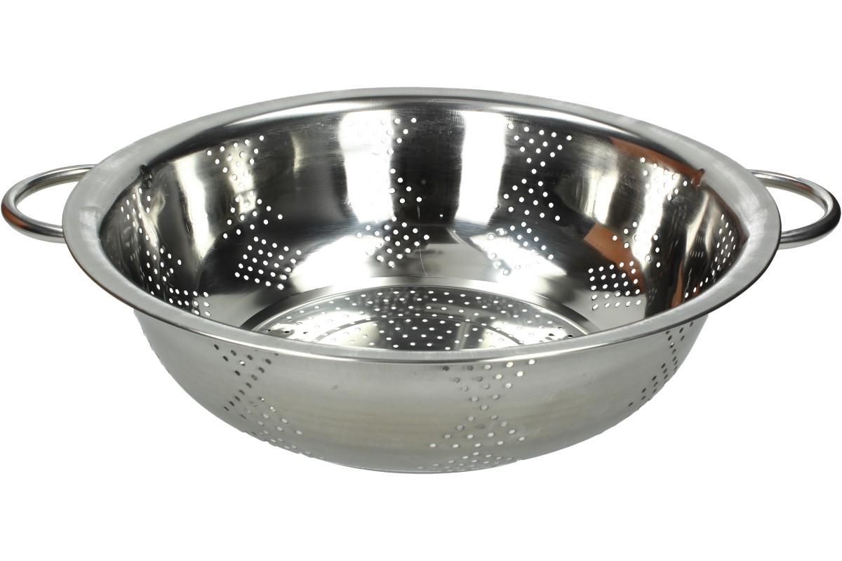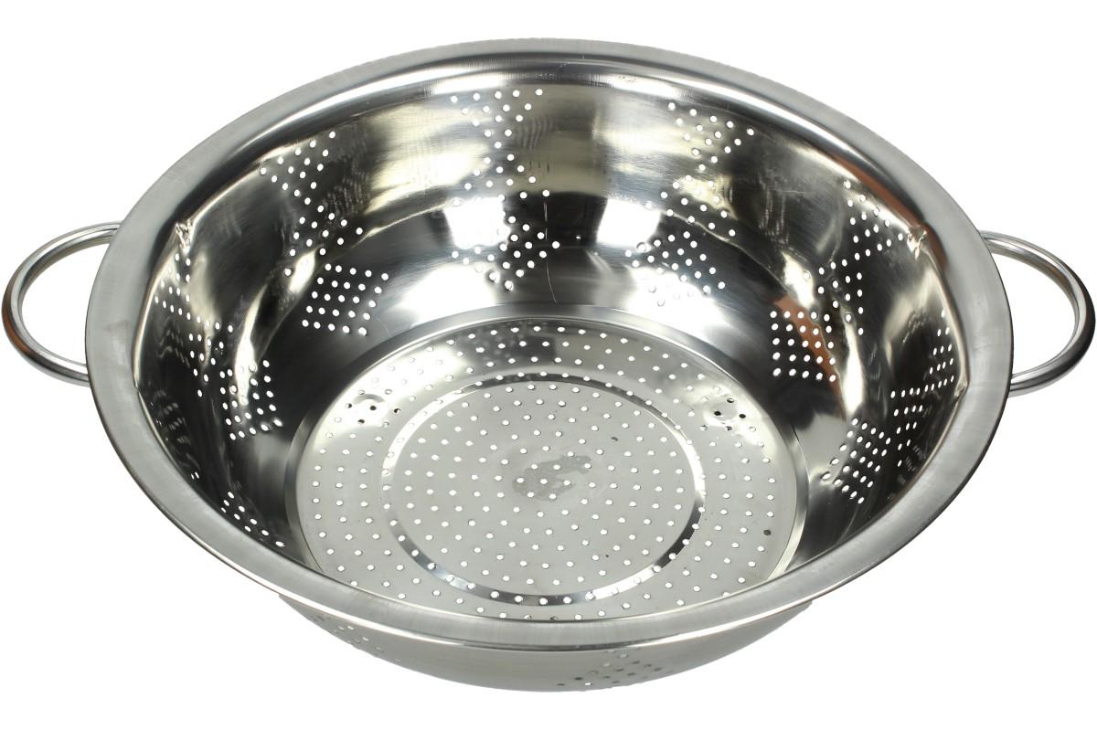 Nerezový cedník s oušky 34 cm by neměla postrádat žádná hospodyňe, ani správně vybavená závodní kuchyň. Využijete ho především při přípravě většího množství jídla např. na oslavu, svatbu, firemní akci, atd. Cedník je vyroben z kvalitního odolného nerezu, který je určený pro styk s potravinami. Je opatřen dvěma praktickými oušky a třemi nožkami, aby se během procesu cedění nepřevrátil. Vhodné na těstoviny, vařenou zeleninu, knedlíky, brambory a mnoho dalšího. Cedník je lehký, skladný a snadno se čistí.