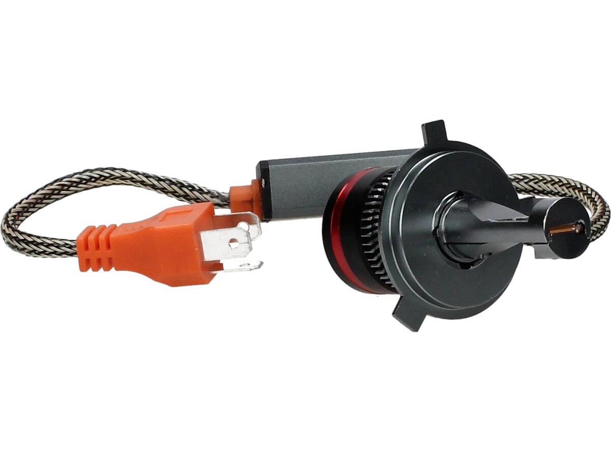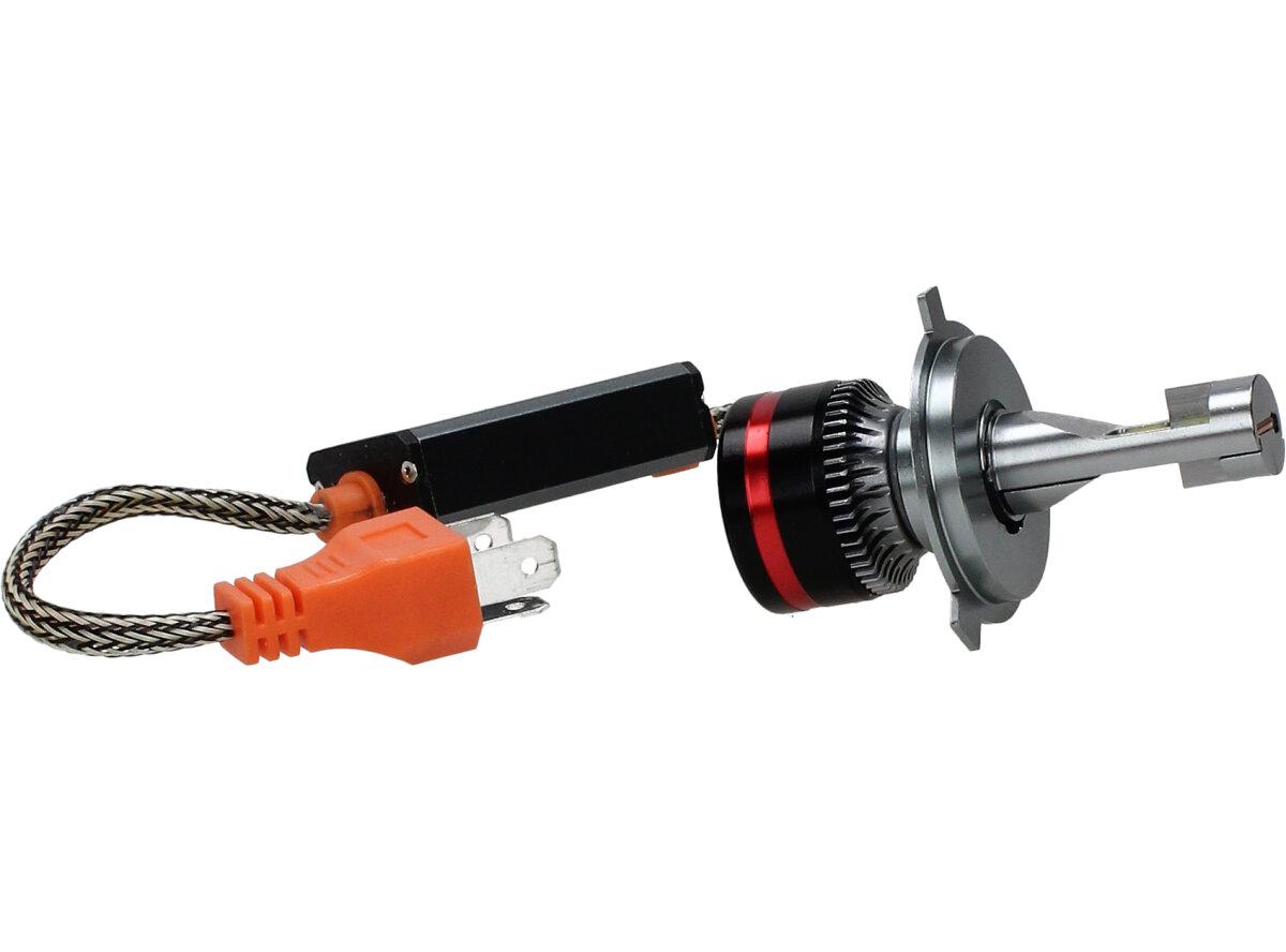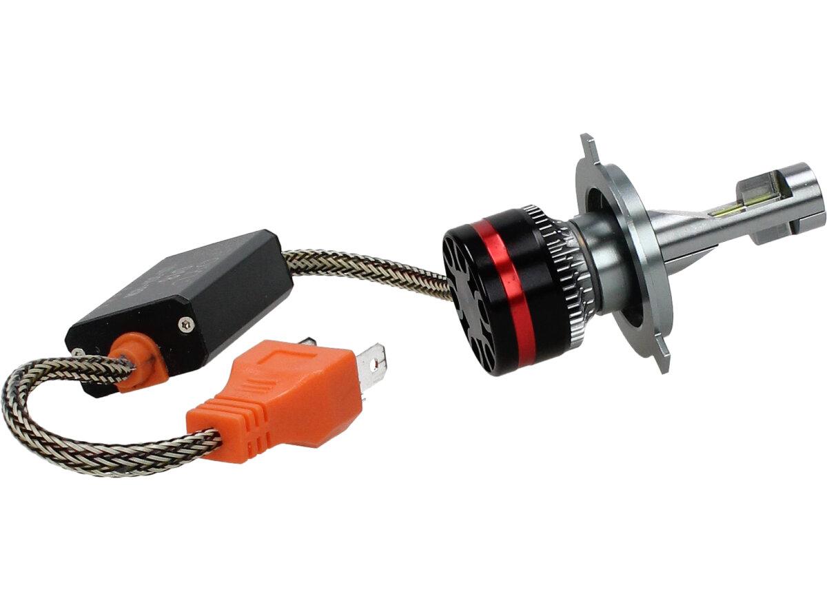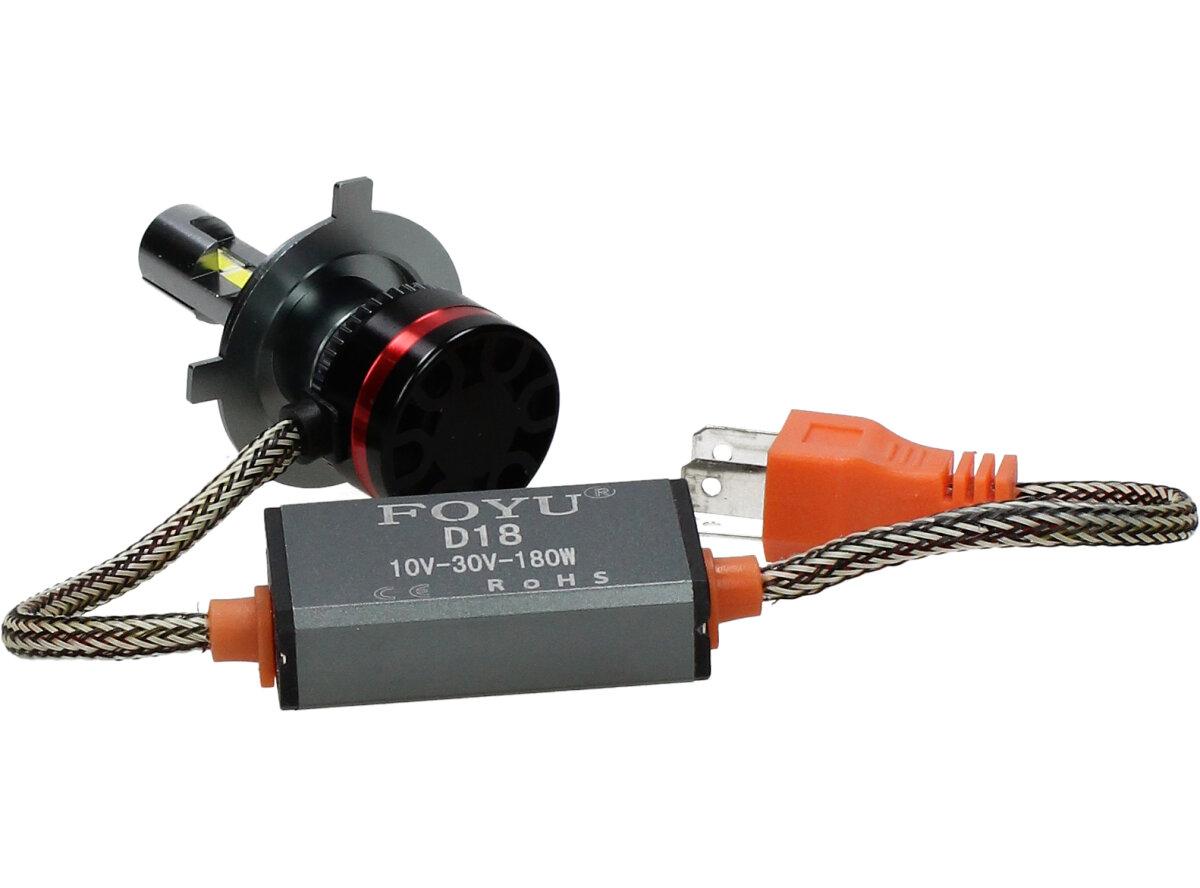 Velice odolná LED H4 žárovka s barvou světla 6000K (studená bílá) do světlometu do auta na 12V, 24V jako náhrada za klasickou nevýkonou žárovku H4. Tato Led žárovka do auta H4 má velký výkon 180W, 20 000 Lm a teplotu světla 6000K. Trafo má certifikaci RohS, samozřejmostí je podpora sběrnice CanBus.