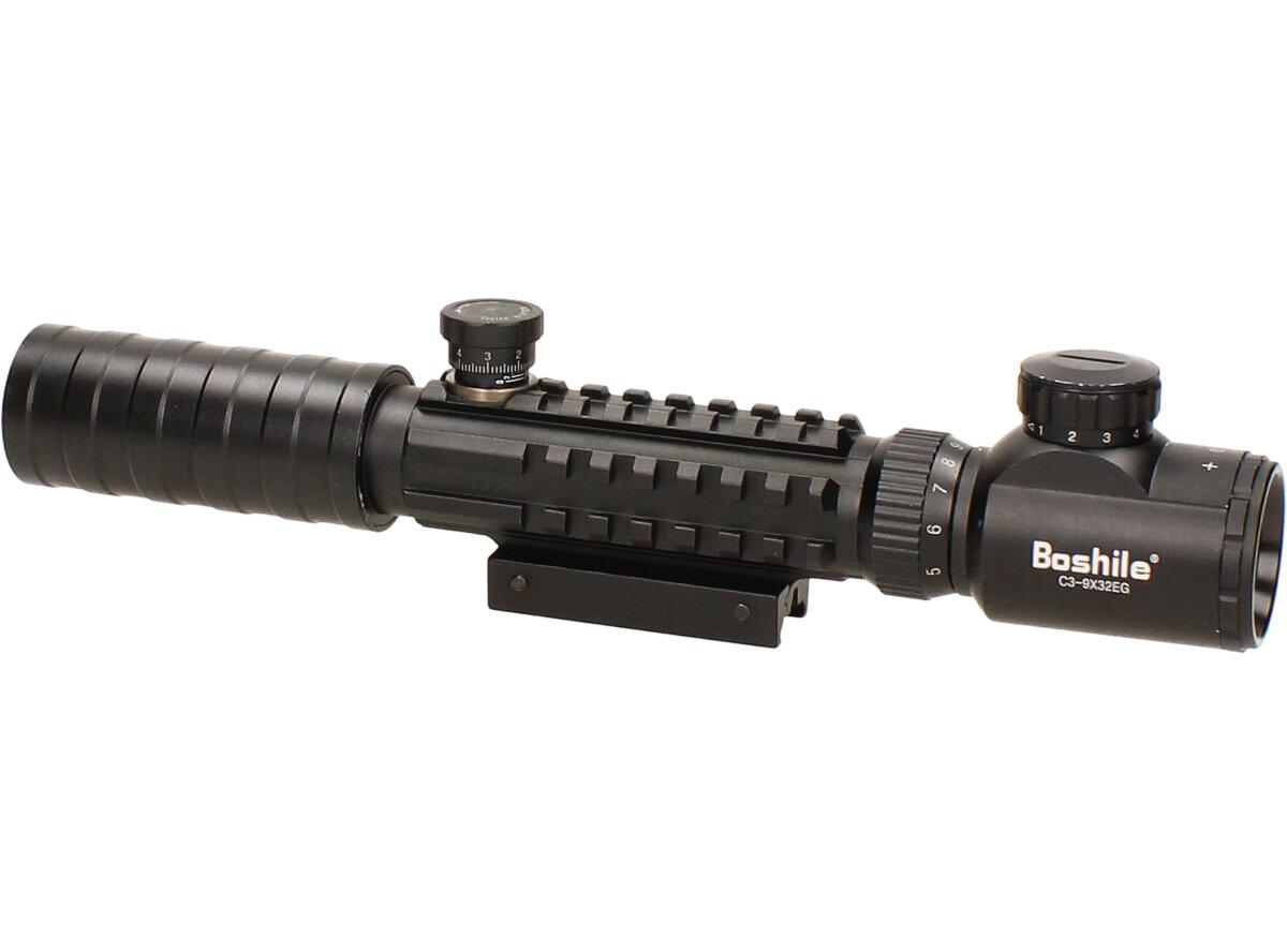 Puškohled Bosile C3-9x32EG s montážní jednotkou na 11mm lištu . Záměrná osnova je v druhé fokální rovině má dvojí podsvícení červené a zelené, široké zorné pole, plně antireflexní, mlze a vodě odolný, kryt optiky. Délka 300 mm, o 42,30 mm, váha 0.5 kg (iz montáží). Kvalitní puškohled vhodný na všechny druhy vzduchových, airsoftových ale i loveckých zbraní. Dodávané s ochrannými kryty na sklíčka. Po upevnění puškohledu na zbraň je možné, že zaměřování a střelba nebude přesná. Pokud tak bude, třeba si puškohled nastavit pomocí dvou nastavitelných koleček. K puškohledu je dodáván i imbusový klíč na upevnění.