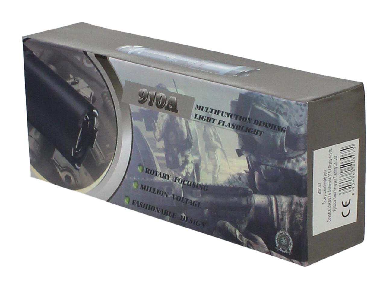 Baterka 910 A s výkonem diody 1 W poskytuje světelný tok 150 lm a zároveň slouží jako účinný paralyzér s napětím až 100 kV. Ovládání je maximálně jednoduché – dvoupolohový vypínač zapíná/vypíná svítilnu, zadní spínač odjišťuje paralyzér a aktivace se provádí stiskem tlačítka. Krátký kontakt vyvolá šok a odradí útočníka, delší způsobí ochromení a ztrátu orientace na několik minut.